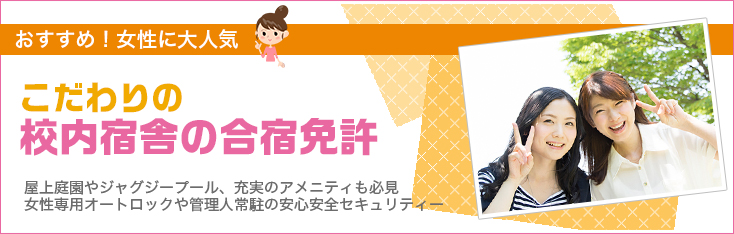 温泉や和紙作り体験など嬉しい楽しい特典盛り沢山!女性専用校内宿舎はオートロックに管理人が常駐しており、いつでも安心安全に宿泊する事が可能です。
